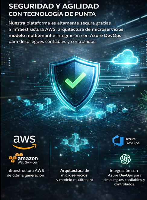 Multitenant, escalable, con monitoreo y backups automáticos.